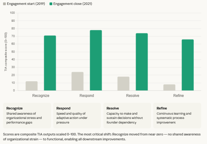 I began with what I call the SV Analysis — an open-response organizational assessment I had developed at that point (later formalized and expanded into the Trajectory Intelligence Assessment, or TIA). The goal wasn’t to generate a report. It was to understand two things: what the highest organizational priorities actually were, and how the leadership team had been responding to pressure — because that tells you far more about an organization’s health than any financial statement.
