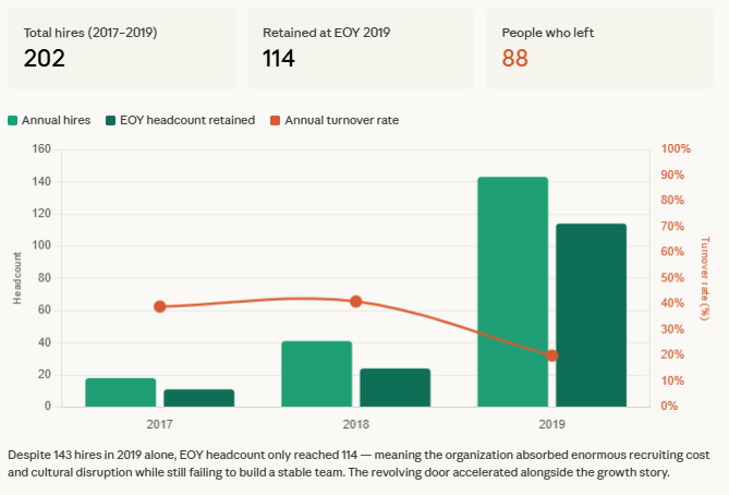 Let that sink in for a moment. A company that began 2018 with 24 employees had hired over 200 people in roughly two years — yet only retained 114 of them. That’s not a staffing strategy. That’s a revolving door with a recruiting budget attached to it.